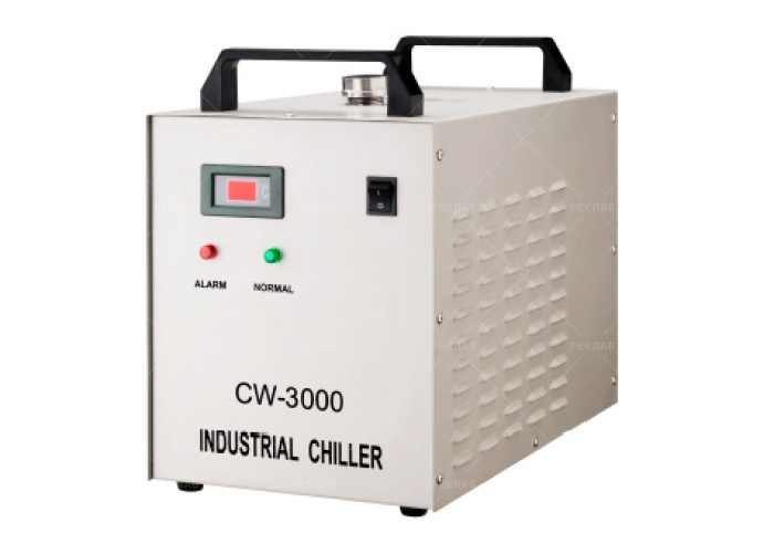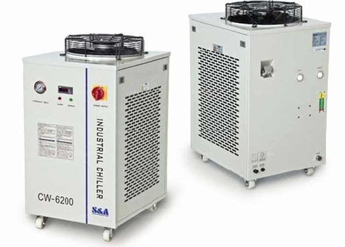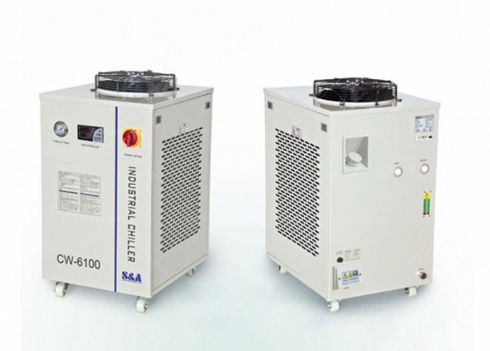 Лазерные станки, использующие СО2-лазеры, нуждаются в принудительном охлаждении лазерных излучателей. При поджиге газа высвобождается большое количество тепла, которое отводят специальные устройства – чиллеры, работающие вместе с лазерным станком.